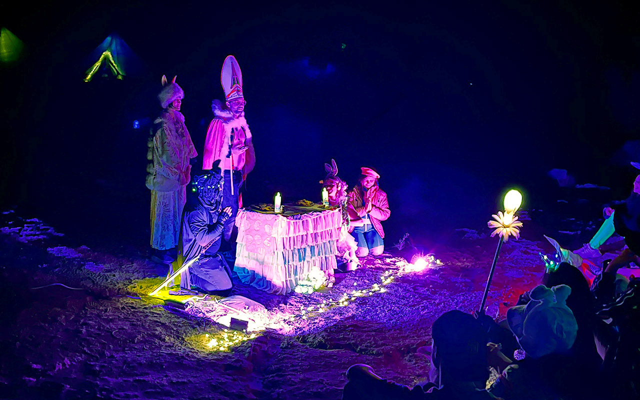 Live Interactive Ceremony - 12am Easter Sunday, April 20th, 2025. At midnight, festival music and Frying are paused, and cult members gather to sit and receive the messages of the service. We are reborn every time we choose to take a step toward freedom, reclaiming what is ours to experience personally and to grow as community that chooses to resist normative societal chains in favor of the untamed beauty of our own, ever evolving version of anarchy.